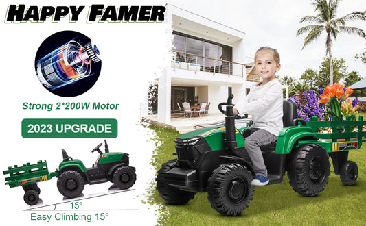 24 Volt Ride on Toys with Remote Control, 400W Strong Engine Battery Powered Ride On Tractor Toys w/ Trailer, 3 Speeds, LED Lights, MP3/USB Music Green